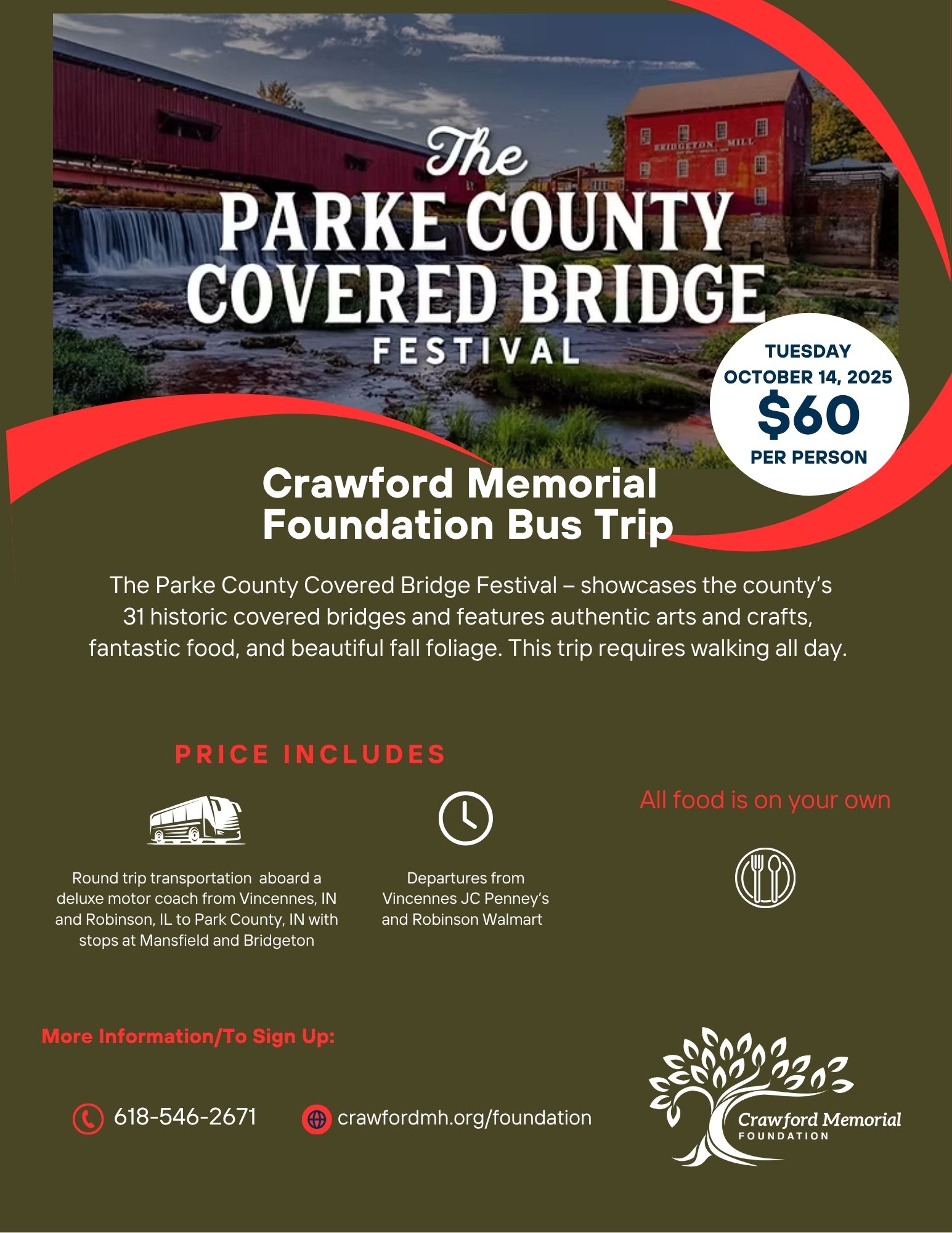 Join us for a day of fun at the Parke County Covered Bridge Festival. You will be walking all day.